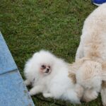 バーニーズ・マウンテンドッグのさくらちゃん(中央)、キャトル・ドッグのリリーちゃん(右)から、さっそく犬社会の厳しさを教えられています。自分より大きいさくらちゃんにも全く容赦しないリリーちゃんです。