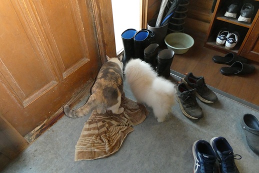 ぬこ(左)が長靴に興味を持っているところに、近づく、ポメラニアンのしーちゃん(右)。ぬこも特に怒るわけでもなく、しーちゃんと仲良く…かどうかは分かりませんが、玄関回りを探索していました。