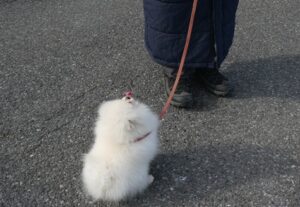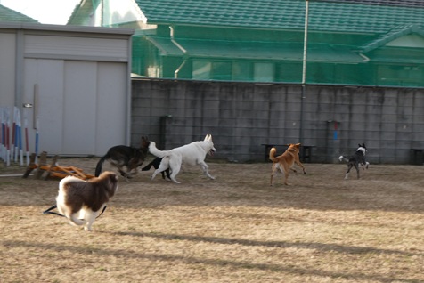 先輩わんこたちとにも興味津々な、アラスカン・マラミュートのライ君(左)。みんなと難なく交流できたものの、走る先輩たちにはさすがに追いつけず、おいてけぼり…。もう少し大きくなったら、きっと一緒に走れるね。