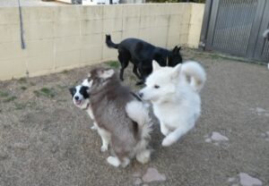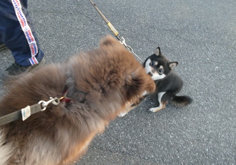 興味津々で柴犬のチョコちゃん(右)に近づく、アラスカン・マラミュートのライ君(左)。年齢的にはチョコちゃんの方が大人なのですが、あまりに大きい「子供」に、ややドン引きなチョコちゃん。すぐに仲良くなるのは難しいようです。