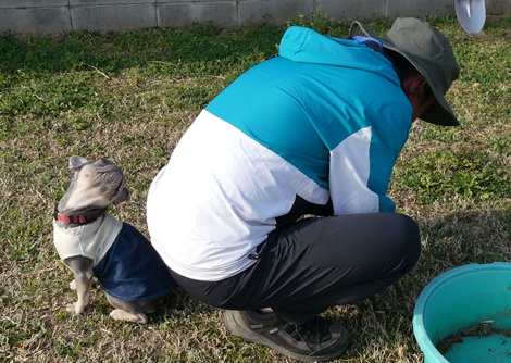 フレンチブルドッグのりろちゃん、所長の草むしりを、おとなしく待っています。でも、早く終わらないかなぁ、と振り返って見ています。首が痛くなりそうな角度です。ちなみに草むしり対象の草は「メリケントケンソウ」という、外来種です。以前にもブログで載せましたが、とげとげした葉っぱが特徴のやっかいな草です。